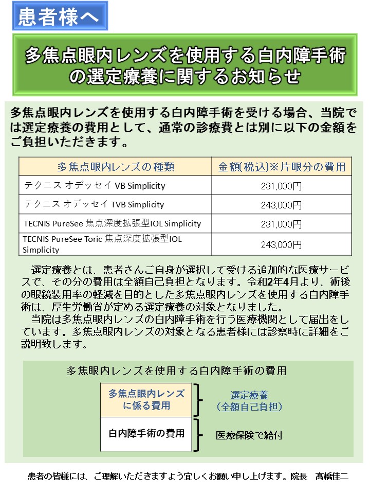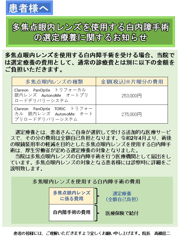 ※白内障手術の予約状況は、トップページでお知らせしております。 ■多焦点眼内レンズ 当院では、多焦点眼内レンズを用いた白内障手術も行っております。 多焦点眼内レンズをお考えの方は、是非ご相談ください。 ※挿入するレンズの種類は、患者様の見え方のご希望などのお話を聞いたうえで医師が判断し手術をしていきます。 ■コンタクトレンズ 当院では、各種コンタクトレンズを取り扱っております。 1日使い捨て、2週間交換、1ヶ月交換、乱視用など… 初めての方も、使用方法などご説明いたしますので、是非ご相談ください。 ※お時間がかかりますので、余裕を持ってご来院下さいますようお願い致します。 ※度数やメーカー等によっては、当日にレンズをお渡し出来無い場合がございますのでご了承ください。 ※カラーコンタクトレンズの販売・コンタクトレンズの処方箋のみの発行はしておりませんのでご注意ください。 トップへ戻る